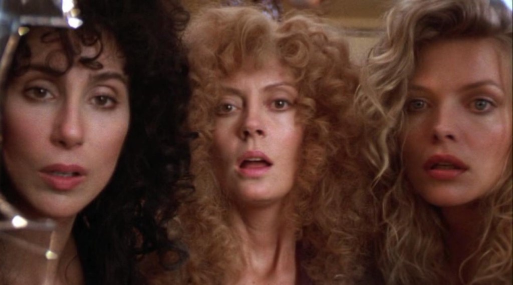 An absolutely marvelous Cher (when isn’t she, though?) plays Alexandra the tough cookie, the funny and sarcastic alpha woman of the group. Jane provides Susan Sarandon the opportunity to play a great arc that takes her from mousy nerd to sultry siren. As Sukie though, Michelle is the heart and soul of The Witches of Eastwick. All of the women undergo a sort of sexual (re)awakening when Daryl Van Horne (Jack Nicholson in deliciously unctuous mode) arrives in their small, sleepy New England town. Yet, even before Daryl the Devil manipulates them for his own pleasure, Sukie is leery of his oily charms. Then, once they’re all under his sway, she still acts as the voice of reason, the friend who can inspire Alexandra to take action and snap Jane out of her carnal cat in heat mode.