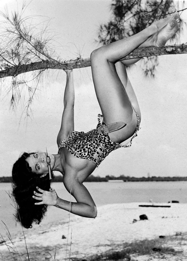 Bettie’s fruitful partnership with model and photographer Bunny Yeager produced some of the most stunning shots of Bettie’s pinup career, including all of the photos I’m using in this post. Yeager was the preeminent pinup photographer of her time and she and Bettie were utterly in sync artistically. The results of their collaborations are pure art pieces. The “Jungle Bettie” photos Yeager took in Florida are absurdly popular, and for good reason: Bettie looks sexy, powerful, and fierce, like an indomitable superhero. So many of these Bettie posts will feature Yeager’s photographs, because the two glamour models made exquisite magic together.