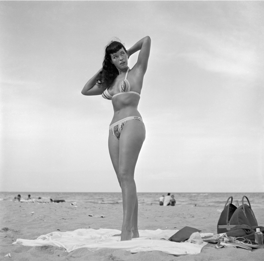 Bettie Page and beaches go together like chocolate and peanut butter. After all, Bettie’s career in modeling began when off-duty NYPD officer and avid photographer Jerry Tibbs approached her on the shores of Coney Island, New York, told her she’d be a great pinup model, and gave her his card. Soon after he was taking photos of Bettie at his studio, even helping make her first pinup portfolio, supposedly free of charge. Tibbs’ faith in Bettie as a model and his kindness helped kickstart the career of the world’s most famous pinup girl, and for that we all owe him a hearty “Thank you!”