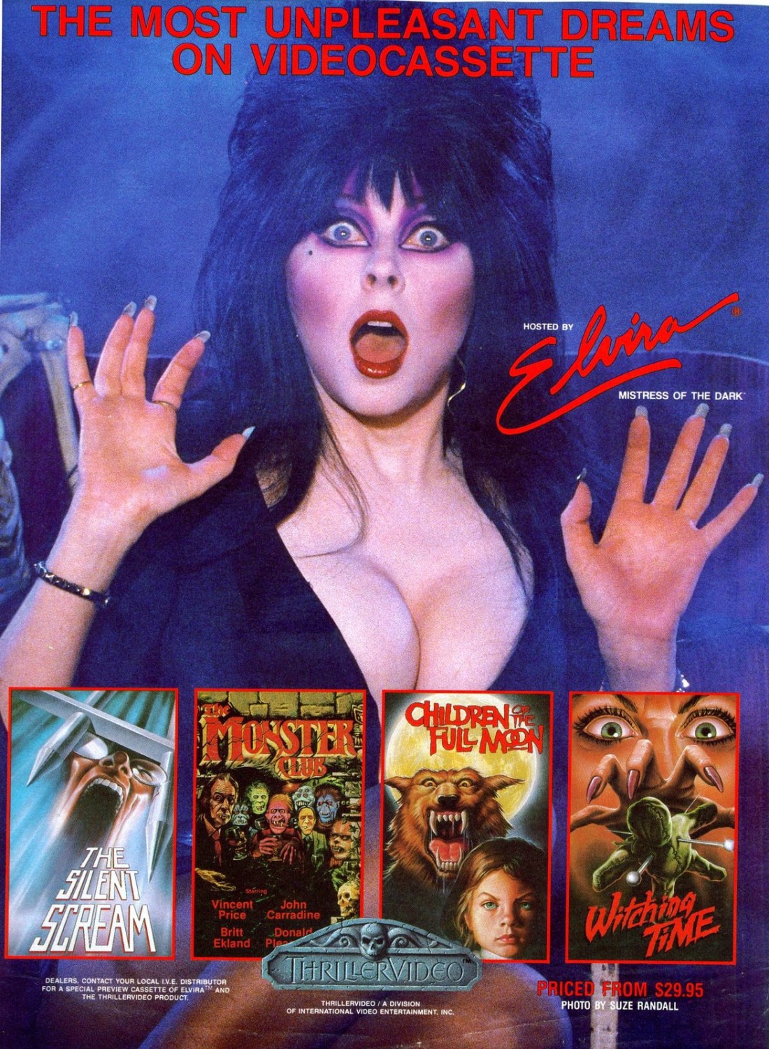 Last time in this space I discussed the popular 1980s Coors and Coors Light ads featuring our favorite horror hostess with the mostess Elvira, Mistress of the Dark. Well, it’s Halloween season and Elvira (Cassandra Peterson) wasn’t just a brew-pitching barmaid, no siree, so I’m bringing her back for another round. Elvira has been the … Continue reading The Art of the Ad: Take Home Elvira with Thriller Video