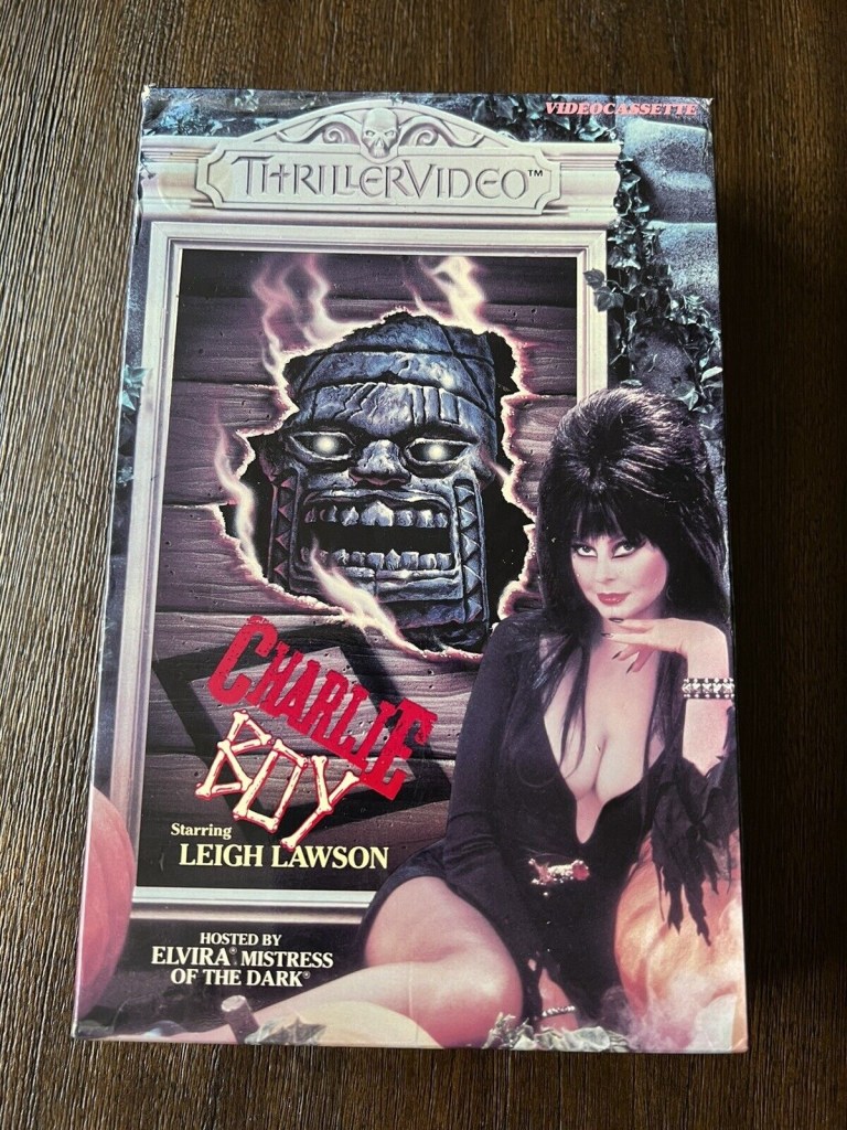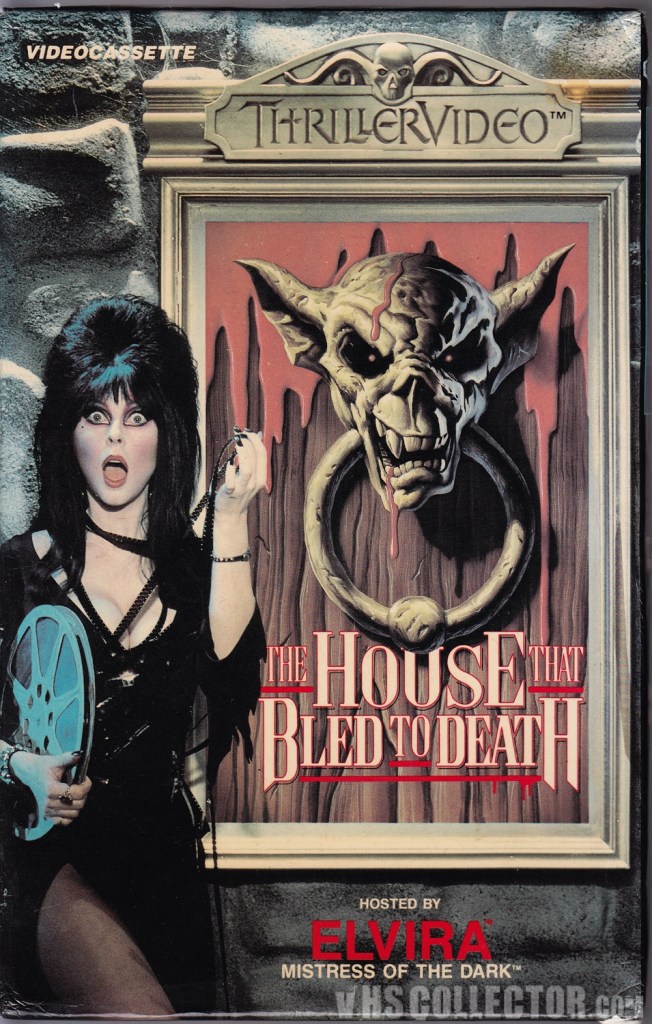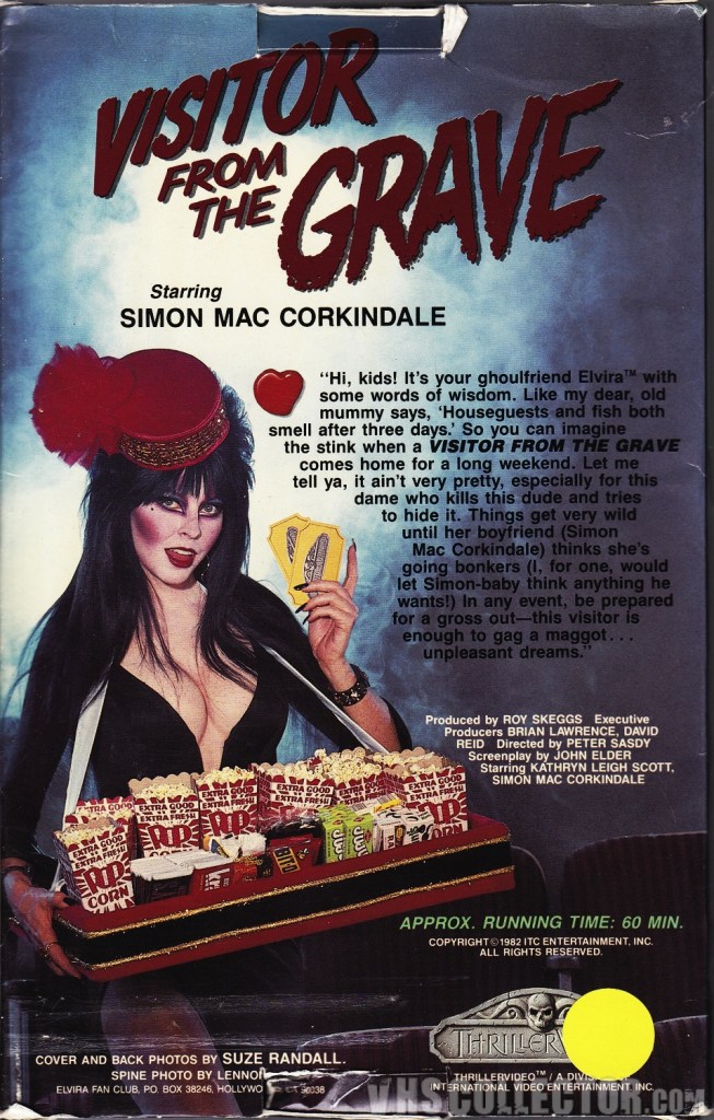 Beyond thirst-quenching drinks though, Elvira has also thrust other products—and, um, her cleavage—at us over the years. One of my favorites was during Thriller Video’s brief ‘80s run of home video horror. Elvira hosted Thriller Video’s VHS releases, appearing before and after each “film,” most of which actually originated as episodes of the British TV shows Thriller and Hammer House of Horror. Alongside their trademark tombstone, Thriller Video put Elvira front and center, knowing full well it was her face—and, um, cleavage—that would sell horror fans on springing for these obscure VHS titles.