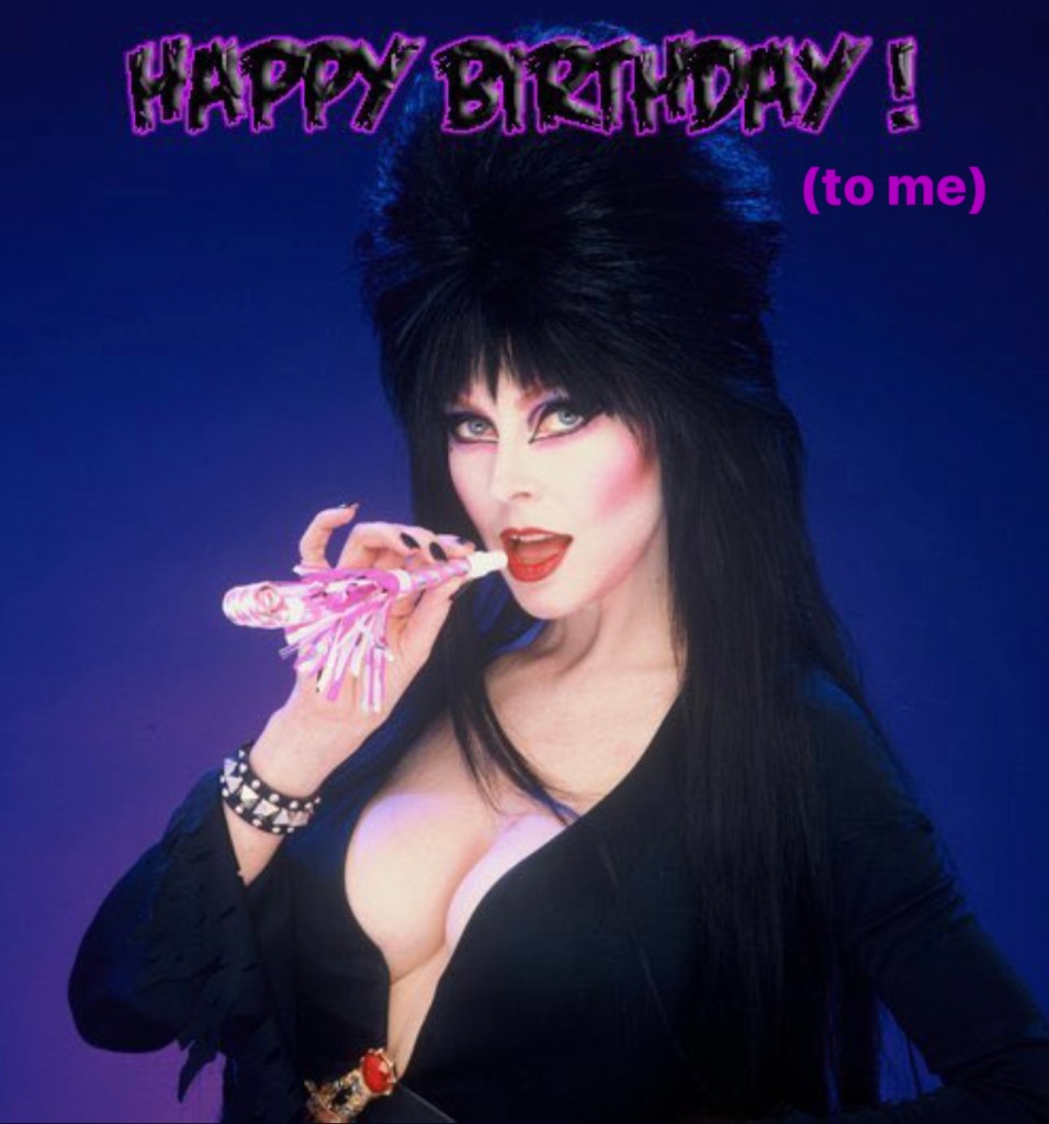 Yep, that’s Elvira, Mistress of the Dark herself, looking really excited to celebrate my latest trip around the sun. I’m just so honored she’s popping out of my cake! What a surprise! I can only imagine how many similar requests she gets, so I feel pretty darn special.