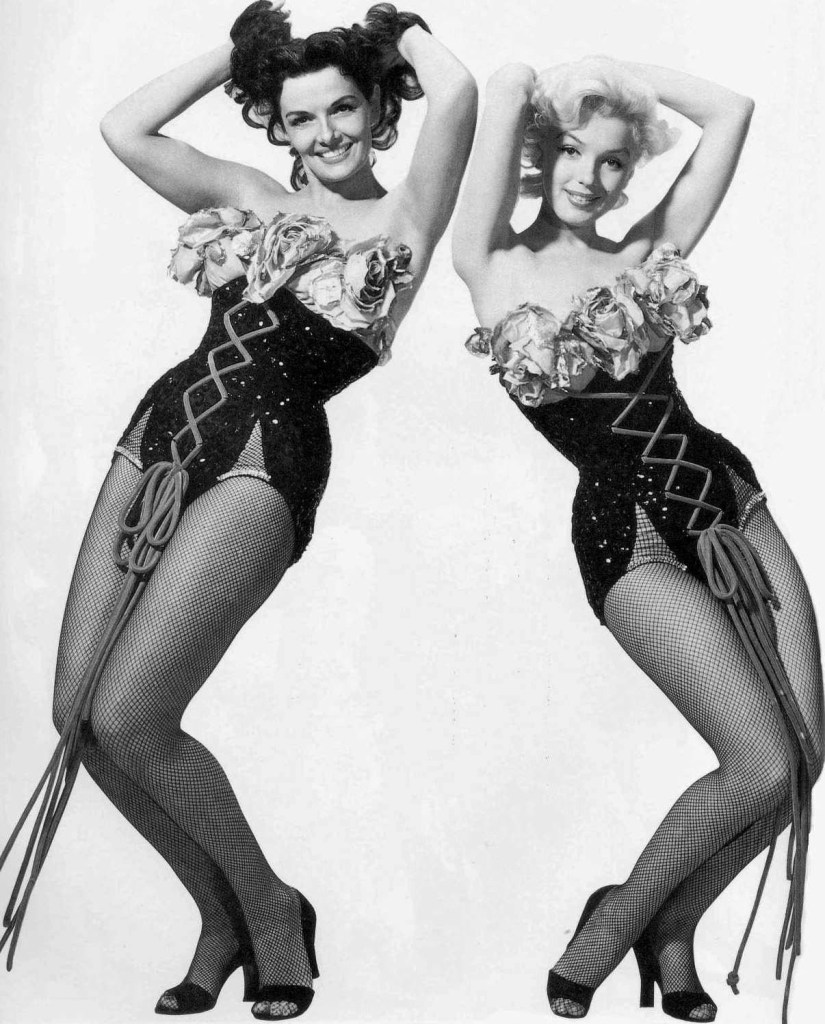 In these publicity shots for Gentlemen Prefer Blondes, Marilyn’s friend and partner-in-mischief Jane Russell joins her for a truly scorching hot moment of fantastic fishnet double trouble. That was a mouthful, but just look at these two!! They deserve all the adjectives.
