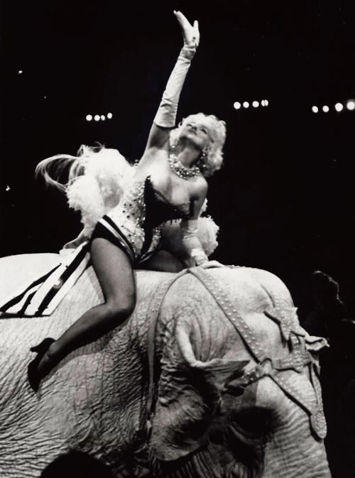 In March 1955, Marilyn rode a pink (!) elephant out to a rousing standing ovation during the Arthritis & Rheumatism charity event for Ringling Bros. Circus at Madison Square Garden in New York City. Looking resplendent in her big top burlesque outfit, Marilyn drove the crowd into a frenzy when she appeared, as multiple accounts reported at the time.