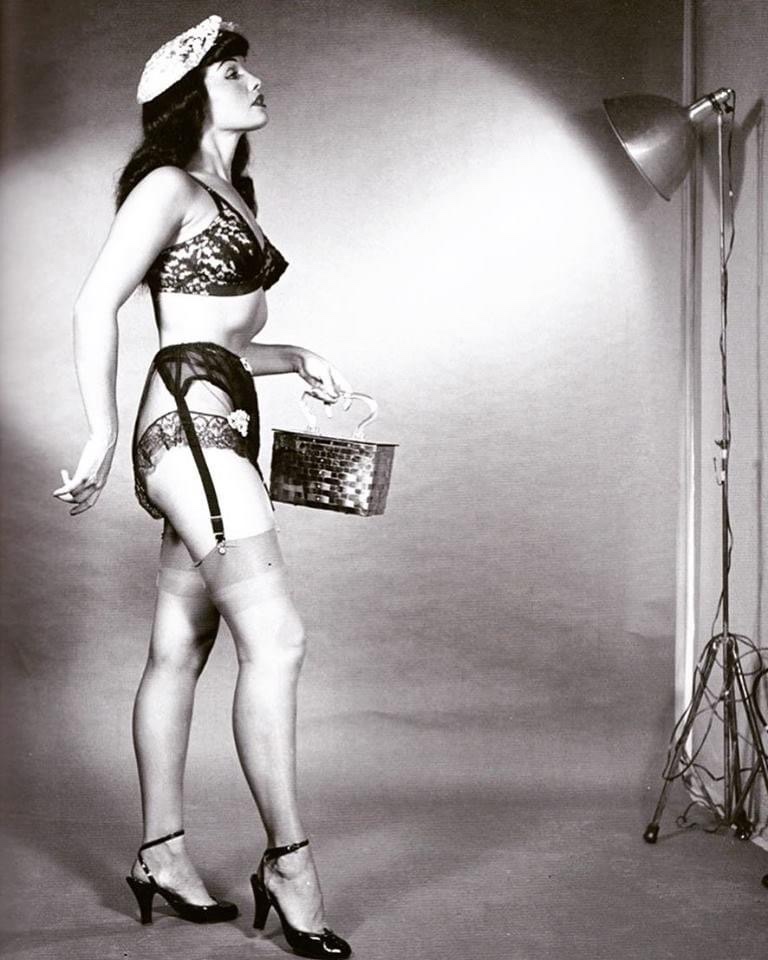 Bettie and her legendary legs lit up the Lounge previously for Thigh High Thursday and Fishnet Friday, among other posts, so consider National Legwear Day a continuation of her global hosiery dominance. Not to sound like a broken record, but nobody ever rocked legwear quite like Bettie Page. For her iconic pinup modeling work, she often paired stockings or thigh highs with lingerie that she herself designed and made. Bettie truly was a Renaissance Woman.