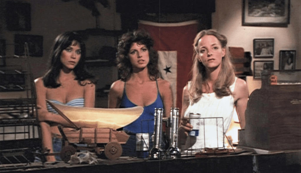 Speaking of fitting perfectly, Eileen sure knows how to fill out a pair of Daisy Duke shorts. Of course, so does her traveling companion Becky—no surprise, as Becky is played by the aforementioned smoke show Tanya Roberts, but more on her another time. Anyway, Robin Sherwood not only makes the most of her wardrobe—let’s not forget the red, heart-shaped sunglasses she apparently brought to the film herself because she felt they suited Eileen’s personality (and she was 100% correct)—but she also delivers every line with a sexy shrug and a seen-it-all snark that is absurdly endearing.