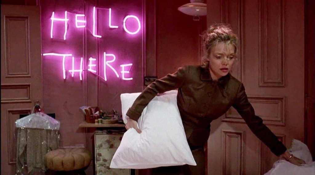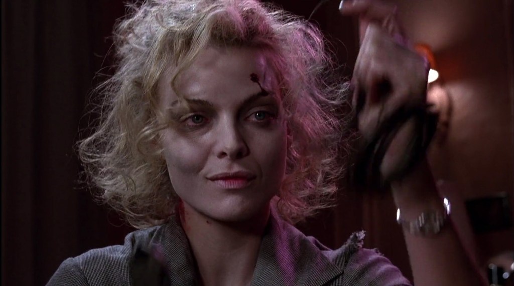 Michelle is pure, raw power in this scene. She’s absolutely captivating, holding us in the palm of her hand as she transforms into the ferocious Catwoman. The scene culminates with Selina slipping into her new skin, the Catwoman costume she spends some of the scene stitching together. Standing in the window, resplendent in her sexy, skintight new duds, the “Hell Here” sign emanating a pink glow behind her, Selina purrs to one of her little feline friends, “I don’t know about you Miss Kitty, but I feel so much yummier.” This memorable scene is indeed one of Michelle Pfeiffer’s yummiest, most iconic, scenes of her career.