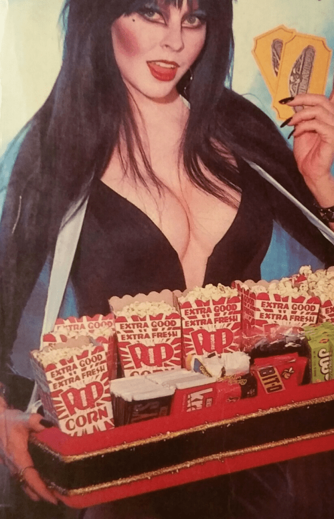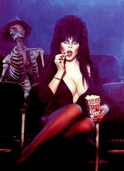 Watching a spooky movie in a darkened theater with Elvira and some popcorn sounds divine, no? Lucky skeleton.