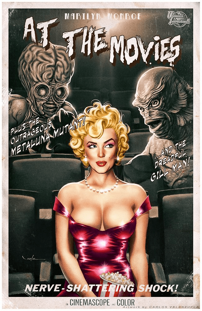 Good luck spotting the popcorn with those classic monsters and Marilyn’s voluptuously illustrated cleavage.