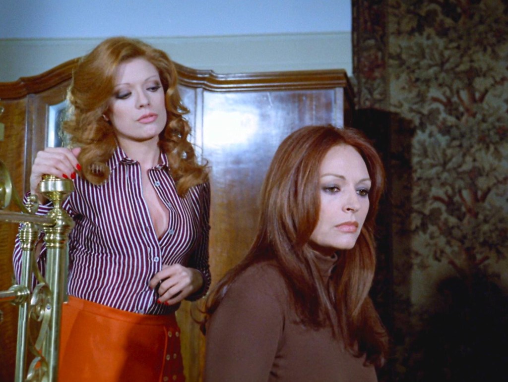 Initially, Spanish horror legend Naschy is our POV character—he also wrote the screenplay—but Gilles is pretty flat, as a character. The film comes alive thanks to the entertainingly neurotic sisters, played by Diana Lorys, Eva León, and Maria Perschy. Claude (Lorys) is the dour matriarch of the group, Nicole (León) the eternally thirsty slut, and Ivette (Perschy) the wheelchair-bound recluse. Together, they live miserably in their sprawling gothic mansion, shooting daggers at each other with their eyes. Director Carlos Aured especially utilizes zooming closeups of Lorys’ intense eyes to great effect.