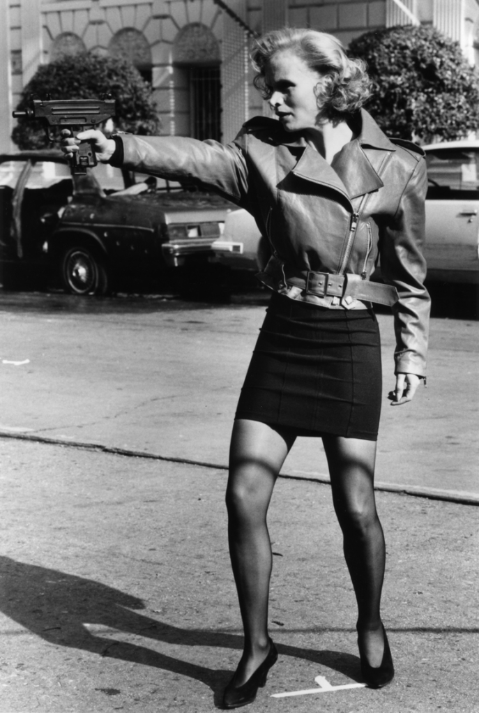 Dutch actress and sex symbol Renée Soutendijk nicely contrasts the shy and reserved Dr. Eve Simmons with the sexed up android Eve VIII. Simmons creates Eve VIII in her image as part of a top-secret government project. I’m curious, were there seven other Eve androids that failed first? Anyway, Soutendijk is terrific in both roles. Watching her strutting around big cities and podunk towns in her black pumps, sexy skintight minidress, and iconic red leather jacket, all while firing her uzi everywhere, is a real sight to behold.