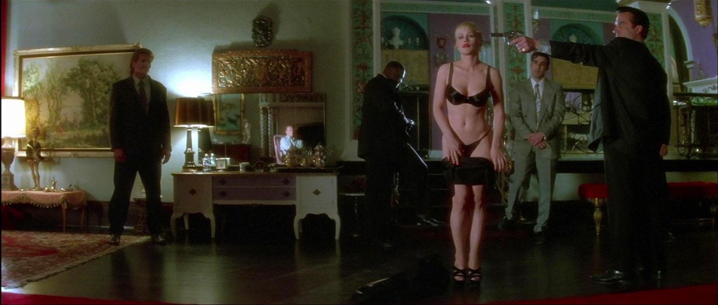 Another disturbingly memorable moment is when an almost impossibly sexy Patricia Arquette is forced to strip at gunpoint. Lynch and cinematographer Peter Deming frame the shot beautifully, with Arquette shedding items of clothing until she’s down to her black bra and panties, while the gun-toting goons stand by watching. It’s intensely creepy, but the artistic compositions and Arquette’s masterful transition from trembling vulnerability to defiant sensuality (“Shoot me daddy. I dare you,” she purrs) work together in perfect harmony. It certainly doesn’t hurt that Patricia Arquette* is a total mood in the film.