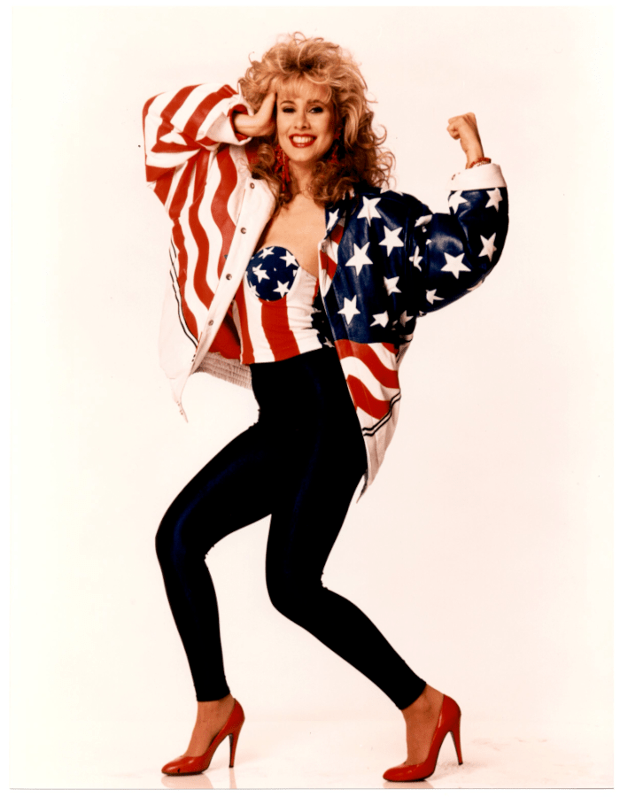 It’s your leggy Lady of Liberty, your red hot American Dream, your pulchritudinous patriot in pumps, your sexy Stars and Stripes bustier babe, your foxy Fourth of July firework, your voluptuous vixen of valor—that’s right, it’s Rhonda Shear, and she’s decked out in her red, white, and blue for America’s Independence Day. Fittingly, Rhonda kept much of the USA Up All Night every weekend in the naughties, and just the mere thought of her today still keeps us Up All Night, too.