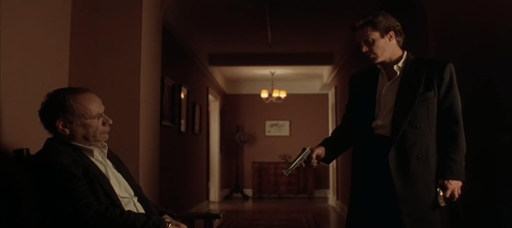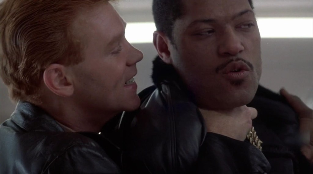 Things happen in this movie. Some movies are a few good scenes interspersed with some yawn-inducing filler. Not King of New York. Every scene is supercharged. A host of young actors on the rise—Fishburne, Snipes, Caruso—practically burst through the screen, their charisma so undeniable that future stardom was never in doubt. After Jimmy Jump orders ten pounds of fried chicken and barbecue spare ribs at a midtown fast food joint, Gilley and company burst in to arrest him. Jimmy whips the bags of food at a charging Gilley, who then spits in Jimmy’s face, after which Jimmy wipes up the spit with his fingers before licking them clean—and this is where you shout “Oh no he didn’t.” But he did! And that’s just one example. So, yeah, things happen in this movie.