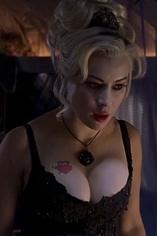 Jennifer Tilly as Tiffany Valentine in 1998’s black comedy horror film Bride of Chucky (and beyond) is one of horror’s more iconic female characters of the last twenty-five years. Tiffany’s Chucky’s former lover and murderous accomplice, but she’s also creative and hilarious, and has even been known to display a compassionate side from time to time. She’s also a stone cold fox. Bride of Chucky makes ample use of Tilly’s, um, ample sex appeal. Pouring Jennifer Tilly’s curvaceous body into one extremely tight outfit after another yields the results one would expect: Bride of Chucky is on fire any time Tilly’s jaw-dropping cleavage, hellacious hips, and luscious lips appear. Even though she’s still fabulous after Tiffany’s soul is transferred into a doll, we’d be lying if we said we didn’t miss ogling Tilly’s wondrous figure.