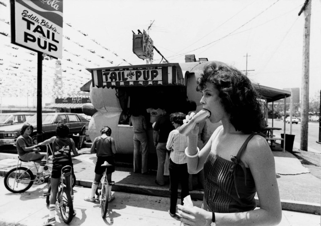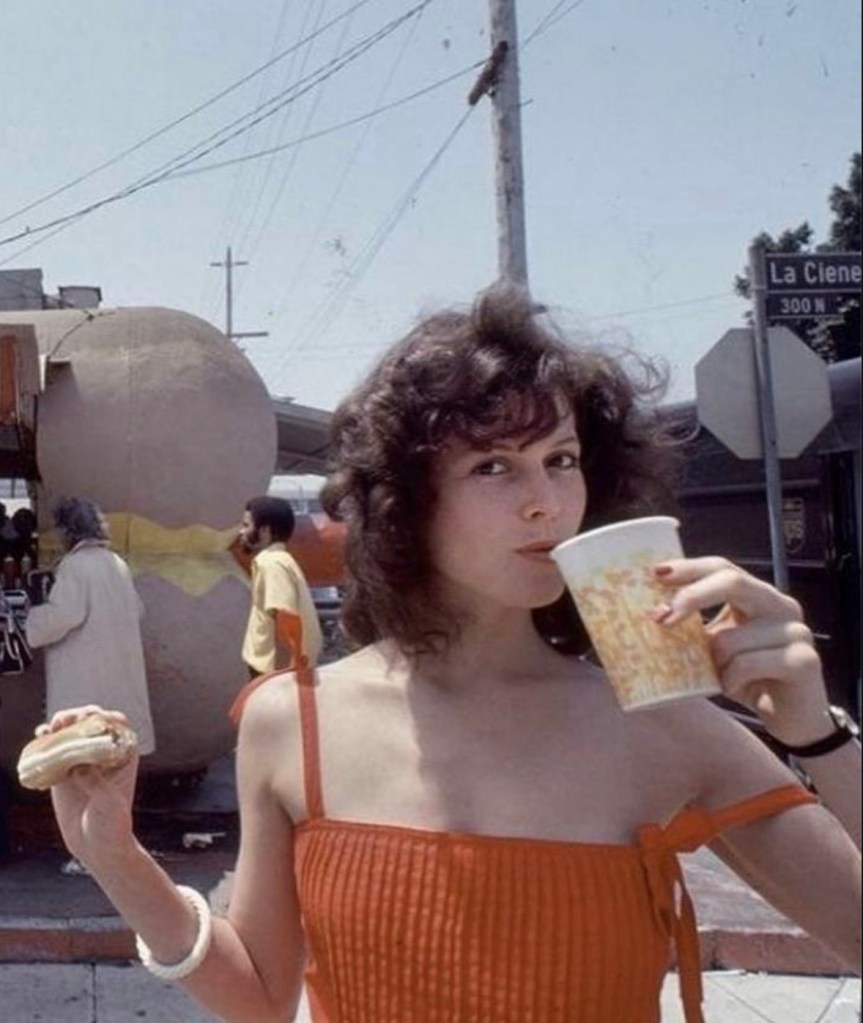 Sigourney Weaver at the famous Tail O’ The Pup hot dog truck on La Cienega in Los Angeles, 1983. Sigourney lives rent free in my heart thanks to so many of her movies, but especially Alien, Ghostbusters, Working Girl, and The Ice Storm, to name just a few. Love, love, love her. These shots of Sigourney swallowing a frankfurter and enjoying a soft drink are pure catnip for this fan. As we say around here: Yowza.