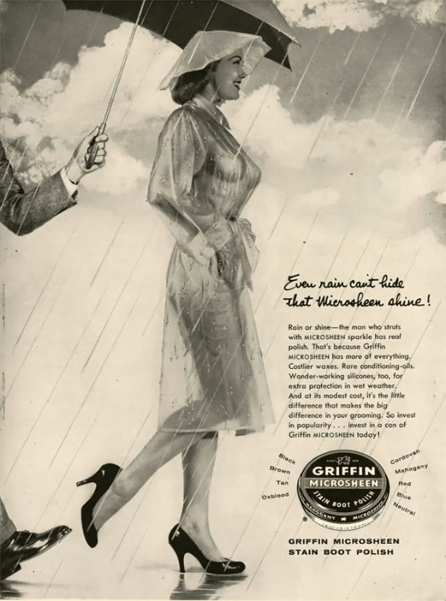 Back in the 1950s, shoe polish brand Griffin Microsheen went all in on the old adage that sex sells. In this series of ads featuring beautiful women marveling at that snazzy Microsheen shine, you’d be hard-pressed to notice anything related to the product, thanks to the leggy, busty, and scantily clad babes. Each ad seems to not-so-subtly hint at a sexual payoff for fellas who shine their shoes with Microsheen. Blatantly suggestive ads like this were de rigeur back then, but few did it as gratuitously as Griffin Microsheen.