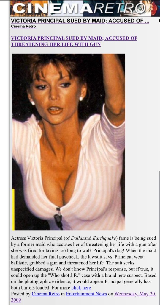 Whoever wrote this 2009 news piece for Cinema Retro deserves all the accolades for gifting us with the sentence, “Based on the photographic evidence, it would appear Principal generally has both barrels loaded.” Hey-o! This tiff between Victoria and her maid ended with the maid eventually submitting a written letter of apology and the case was dropped. Don’t fuck with Vicki! And here’s a closer look at this double-barreled badass.
