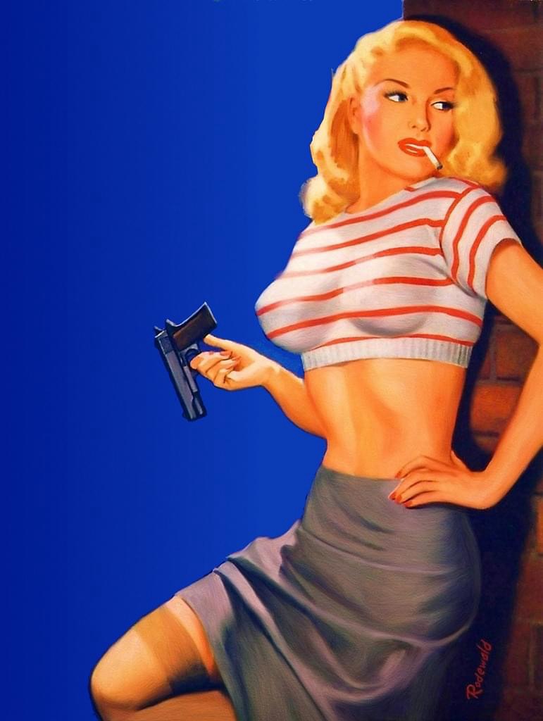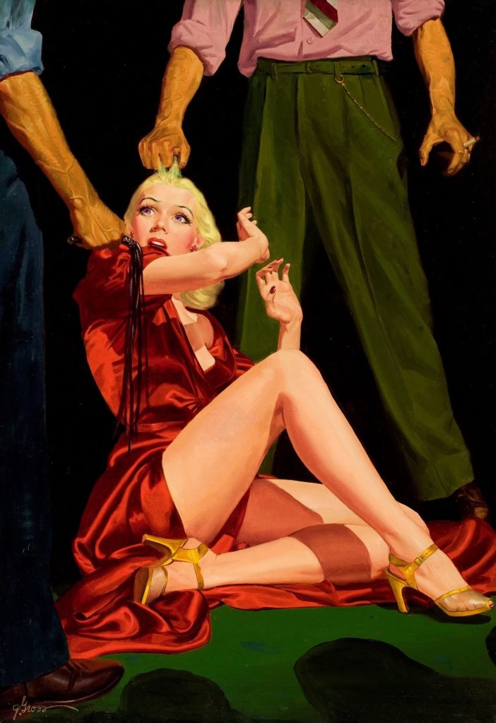 Now let’s kick back, light an unfiltered Lucky Strike, and gaze at a selection of art featuring the delicious dames and gruff gangsters of pulp, along with a few horror and sci-fi shenanigans too. Much of the art here is of the vintage Golden Age of Pulp variety, while others are more modern takes on the venerable pulp tradition.