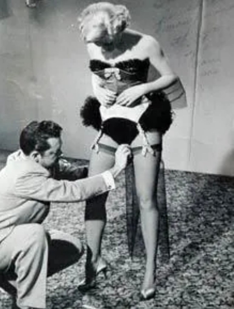 Marilyn getting some help with her thigh high stockings and suspenders. How does one go about getting that job? Once again, asking for a friend.