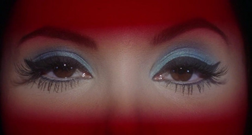 One memorable—and disturbing—scene finds Elaine writhing erotically on the bed, wearing nothing but a sexy white bra and panties, and a wide-open sheer negligee. Moaning in apparent ecstasy, she sensually caresses her body, while flashing back to her past. We see she’s remembering her time in a coven, in which she is stripped and bound in an initiation ritual that appears to cause her great discomfort. As she recalls this trauma, she continues to stroke herself and moan in delirious ecstasy. The juxtaposition of apparent abuse and intense arousal is jarring. Robinson’s sheer sex appeal is on full display in this scene. It’s like Biller is daring us to be titillated by Elaine’s sensuality even in the face of her past trauma.