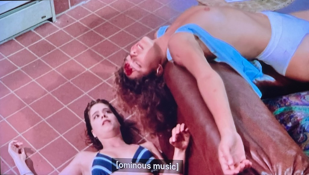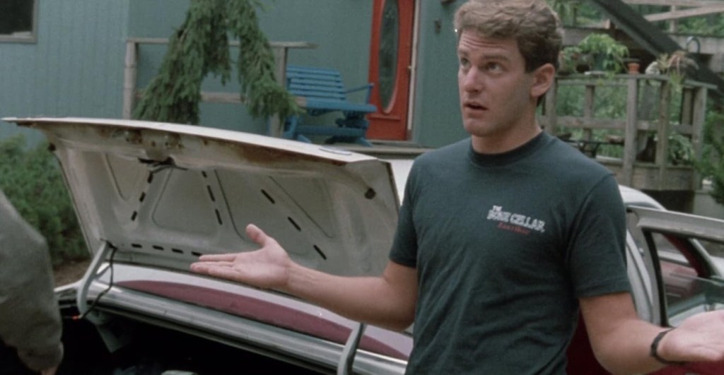 Many have claimed that Rolfe Kanefsky’s 1991 horror comedy There’s Nothing Out There is the first movie to feature the now-trope of the self-aware horror-watching nerd character. Yes, years before Randy (Jamie Kennedy) in Scream (1996), we had Mike (Craig Peck) in There’s Nothing Out There dropping his exhaustive knowledge of horror movies left and right while his dopey friends get picked off by some sort of alien frog creature at a cabin by the lake where the teens went to partay and roll in the hay, if you know what I mean, and I think you do. I can’t vouch for this claim, but it sure seems possible that it’s true. Mike is definitely a proto-Randy who keeps himself and his friends one step ahead of the monster thanks to his expertise in horror tropes.