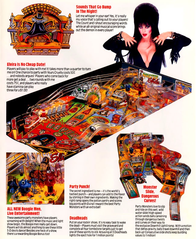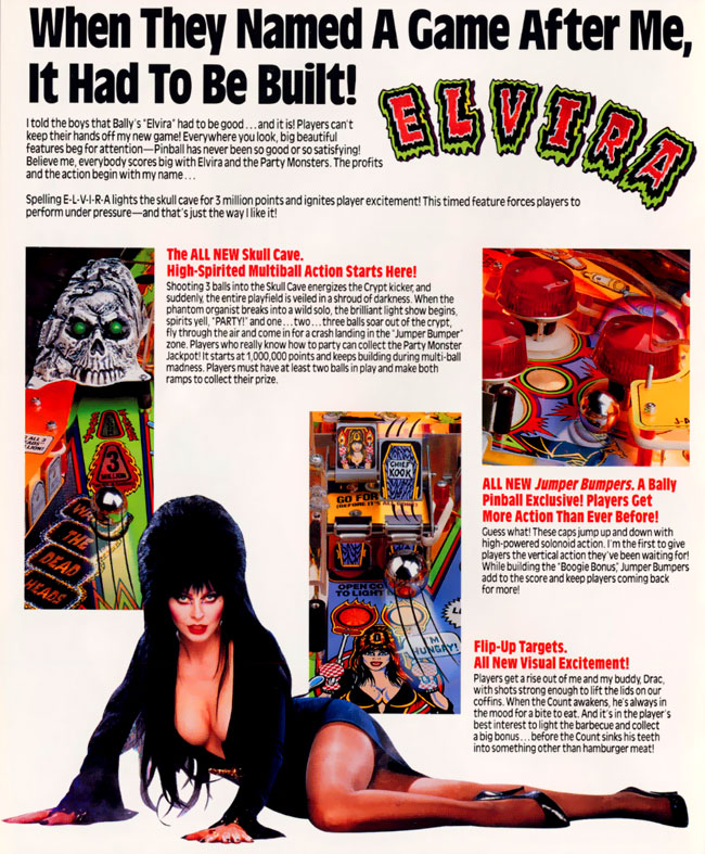 Just in time for Halloween season, today’s post features ads for the various pinball machines to bear Elvira’s name and likeness over the years. As you might imagine, the games are a lot of fun, but getting scared, erm, uh, stiff by the lovely Elvira is really what it’s all about. After all, these pinball machines might be built, but the smoking hot babe they’re named for is BUILT.