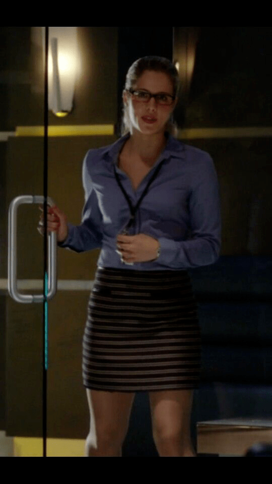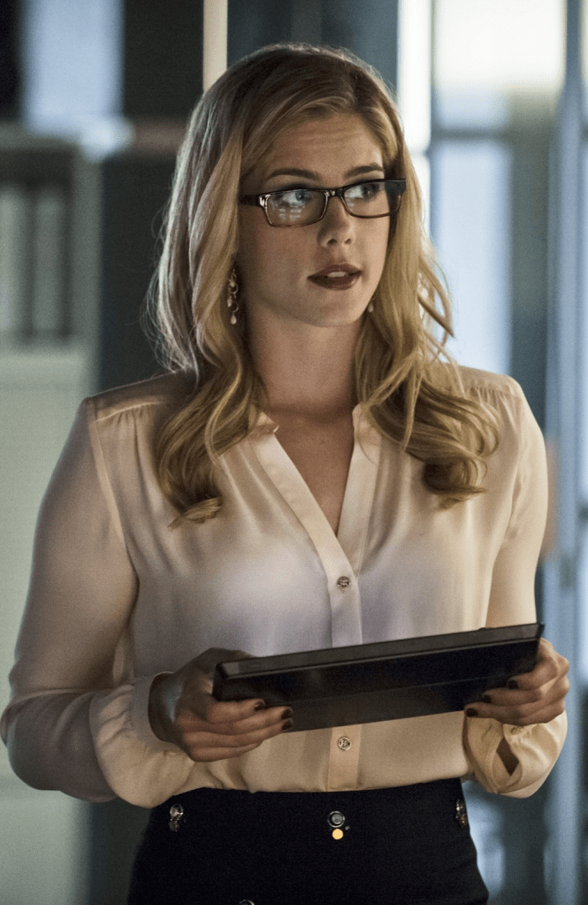 When I first met Arrow’s resident IT nerd Felicity Smoak in the season one episode “Lone Gunman”, it was lustful crushing at first sight. As played by Emily Bett Rickards, Felicity’s look was absolutely iconic: blonde hair, tightly pulled back in a ponytail; rectangular-framed glasses; tightly fitted shirt, unbuttoned dangerously low for office life; and a short, tightly fitted skirt (are we sensing a “tight” theme yet?); and sexy high heels. The minute Felicity appeared, the needle on my geek radar spiked, if you know what I mean, and I think you do. We all have types, and Felicity brings one of mine to life with absolute perfection. Basically, she’s the archetypal Geek Girl of nerdly fantasies and I’m utterly powerless against her. I know for a fact that many geeks worldwide felt the same way, and I strongly suspect the writers of Arrow did, too.